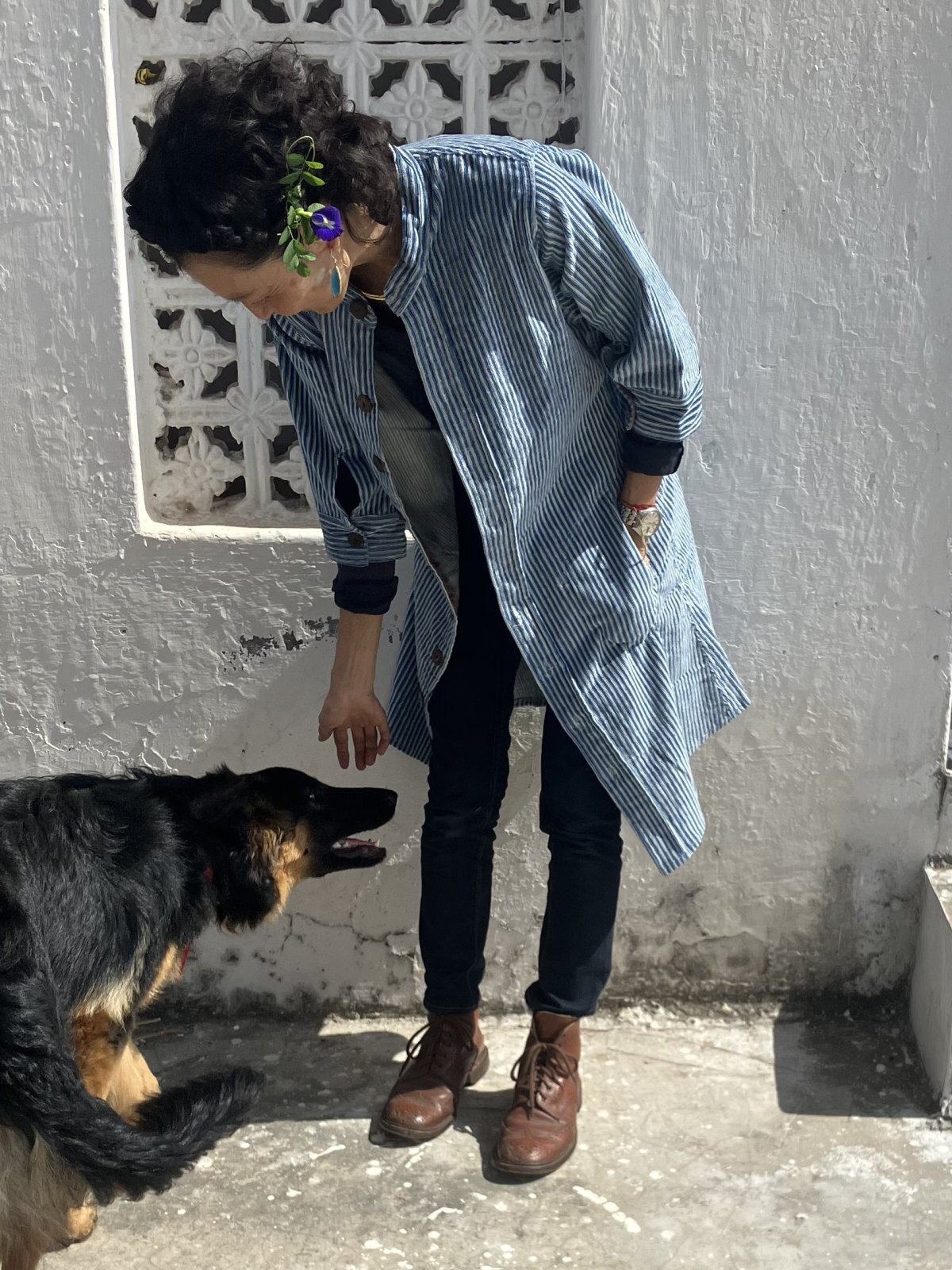 国産藍染コーデュロイ生地を日本よりインドの工房へ持ち込み