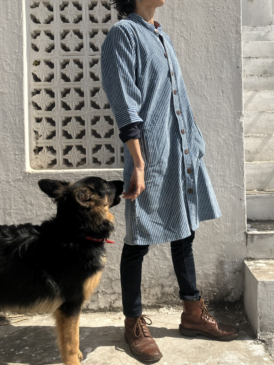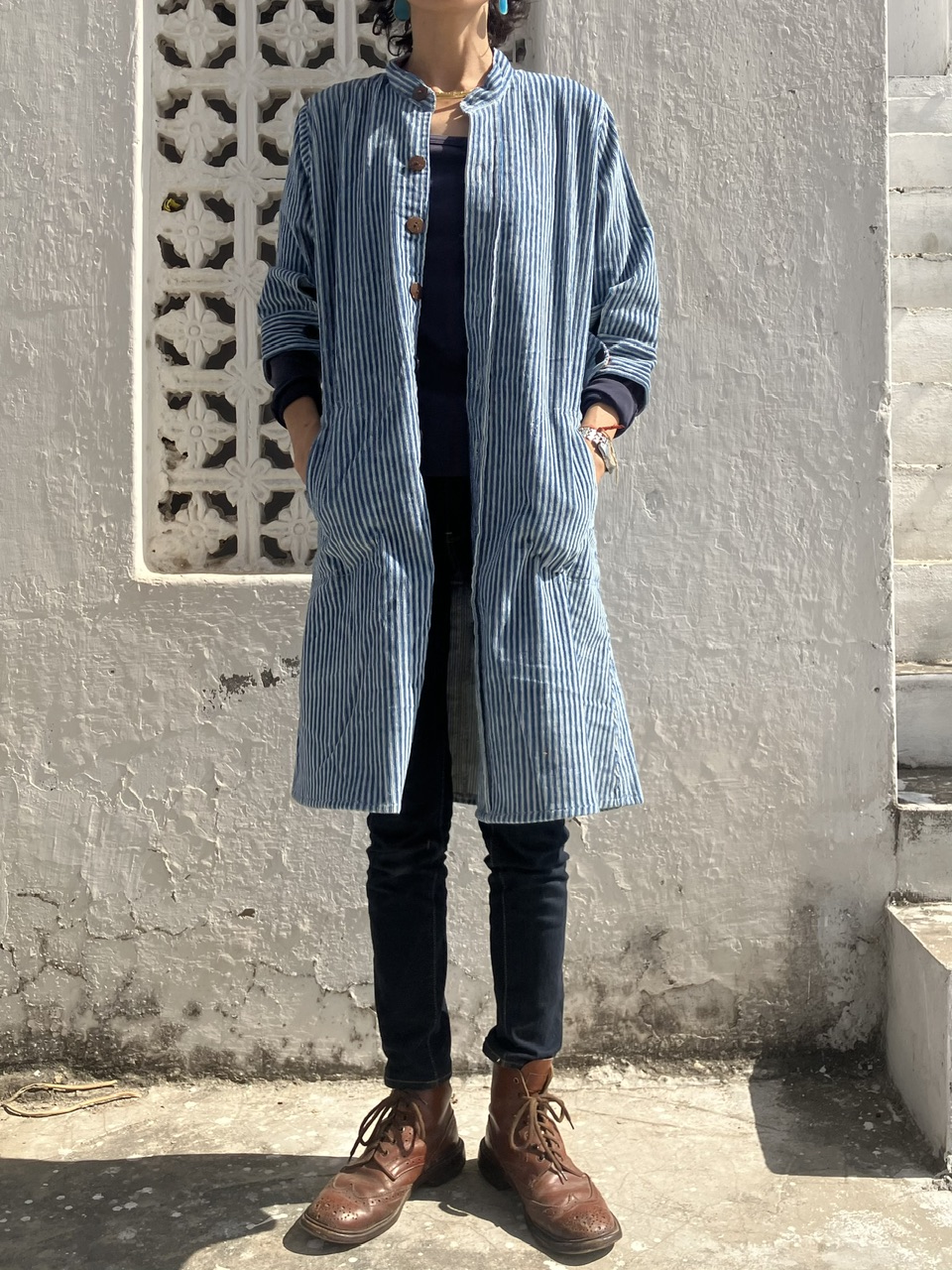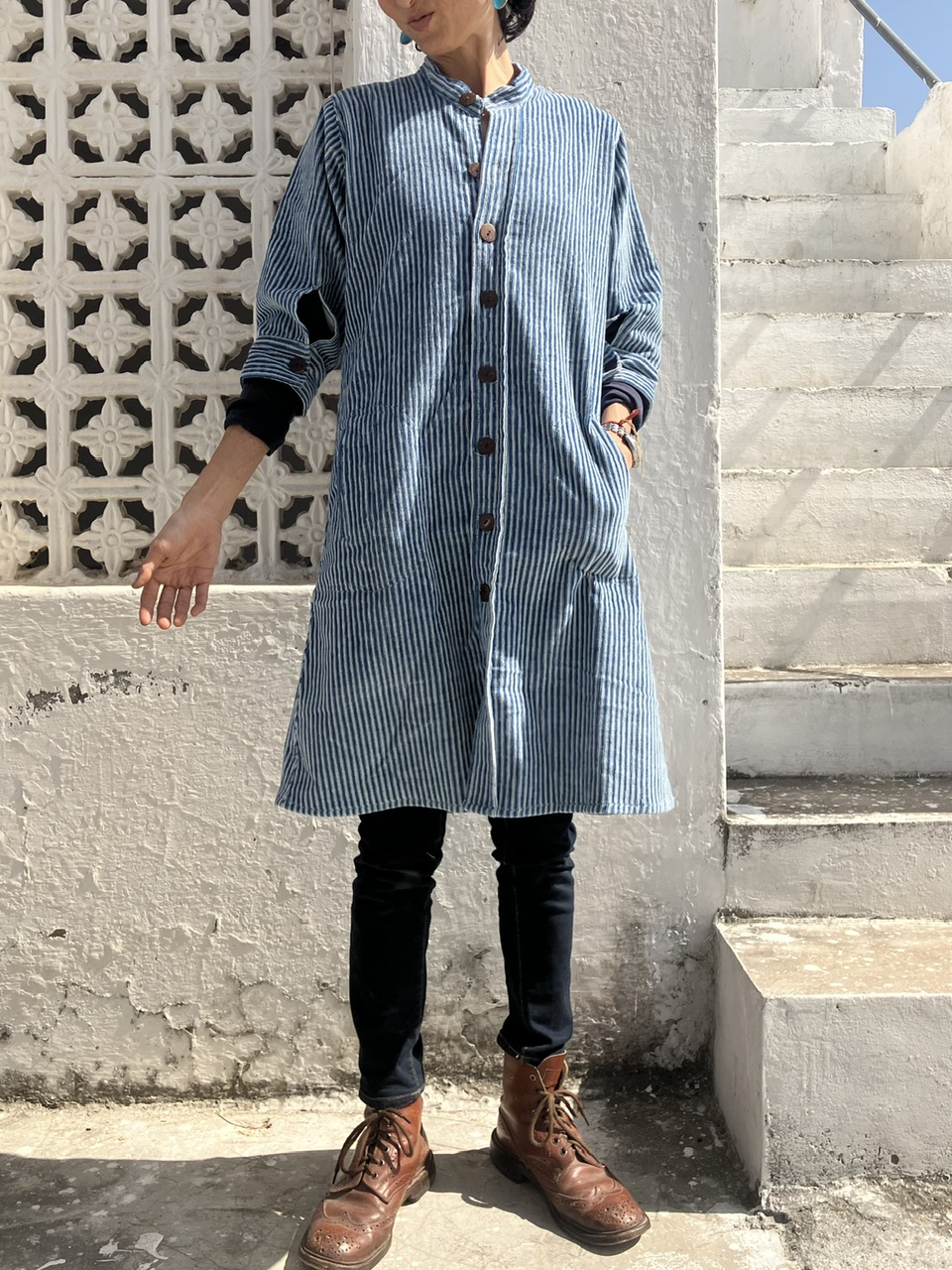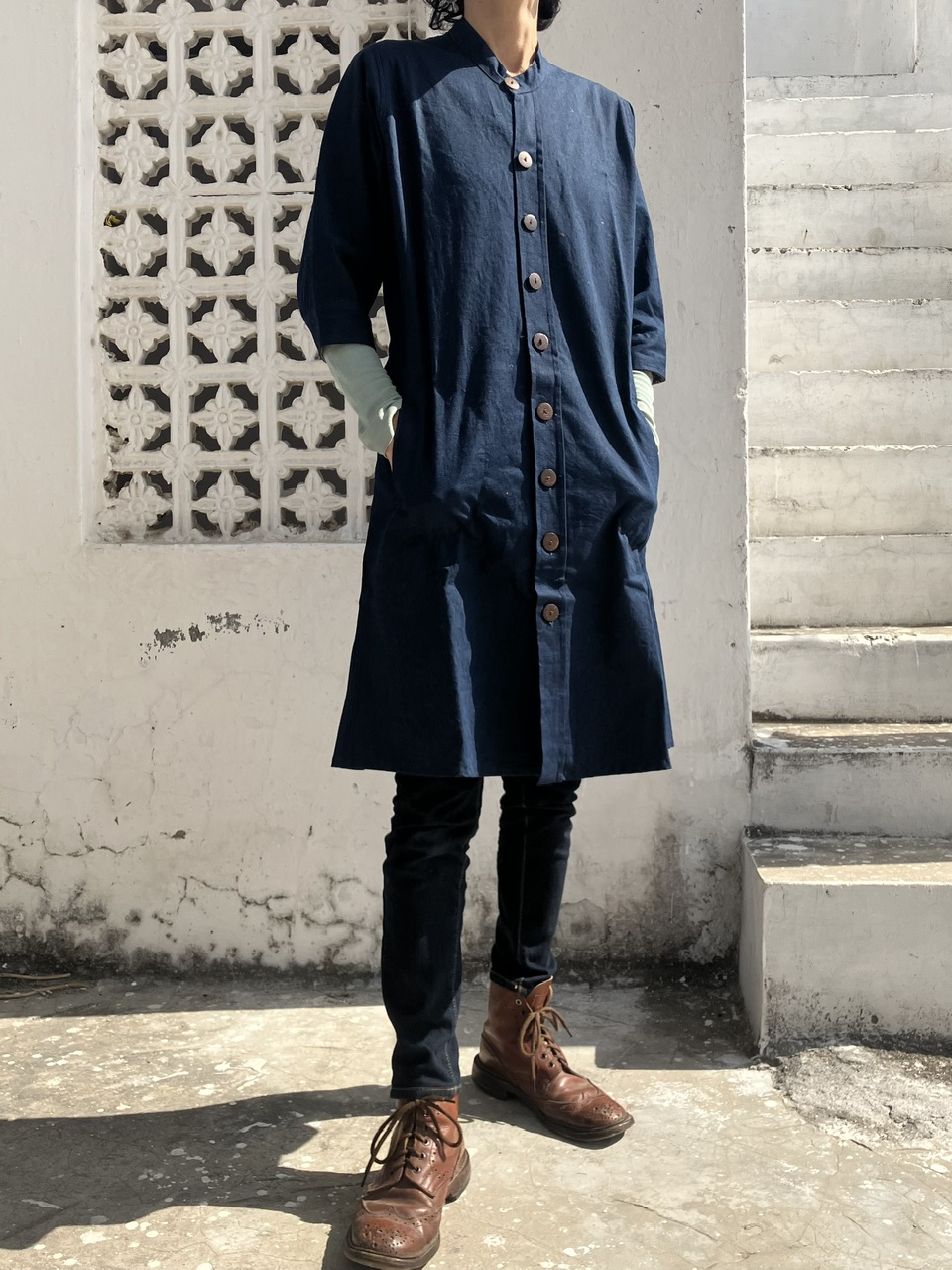 藍染リネン100% クルタワンピース★ボタンダウン膝丈 -