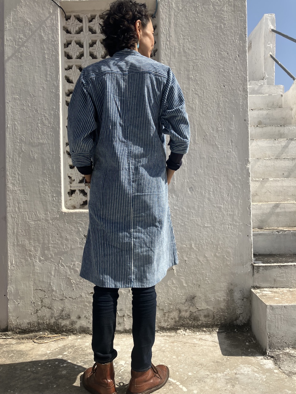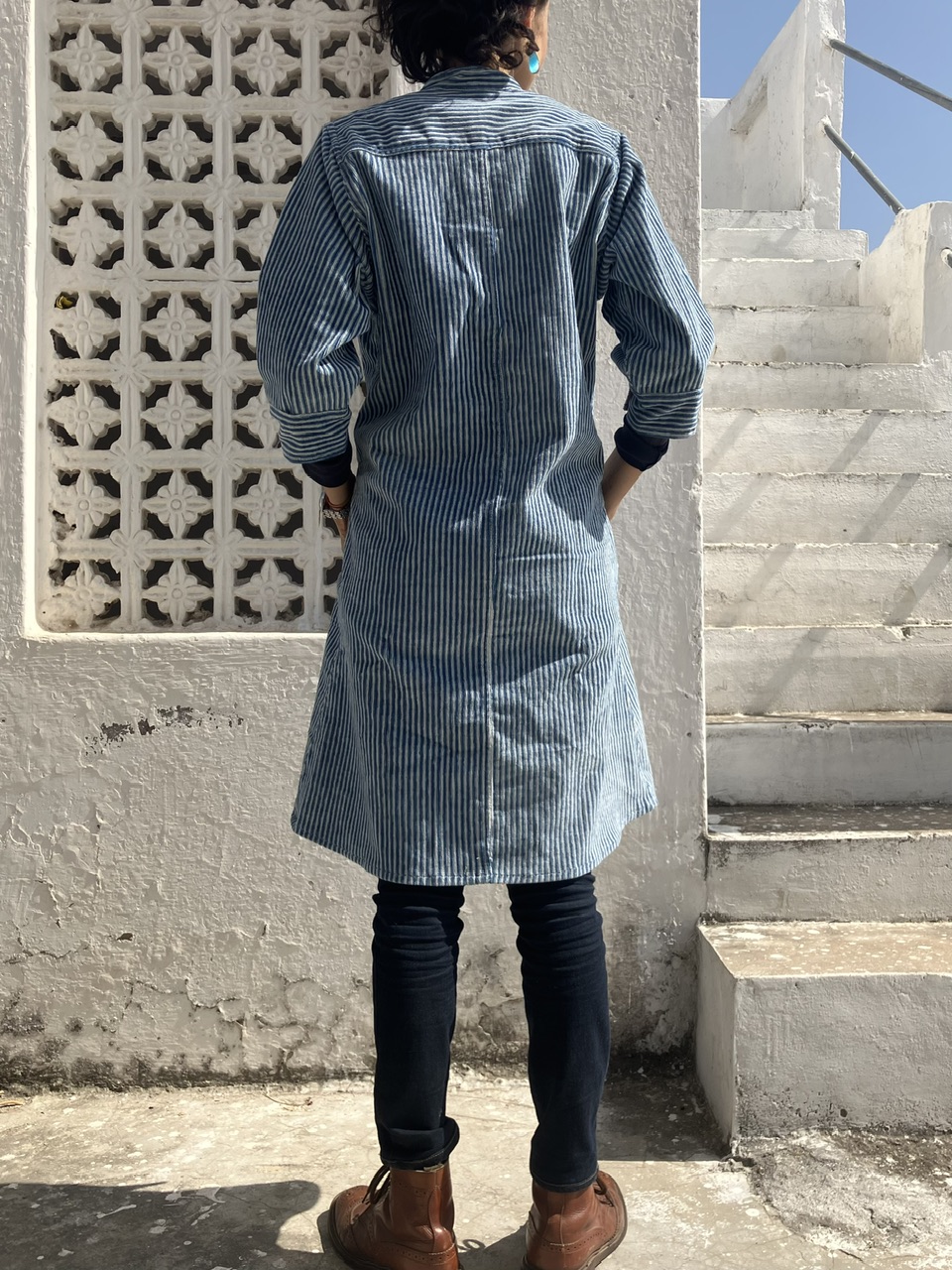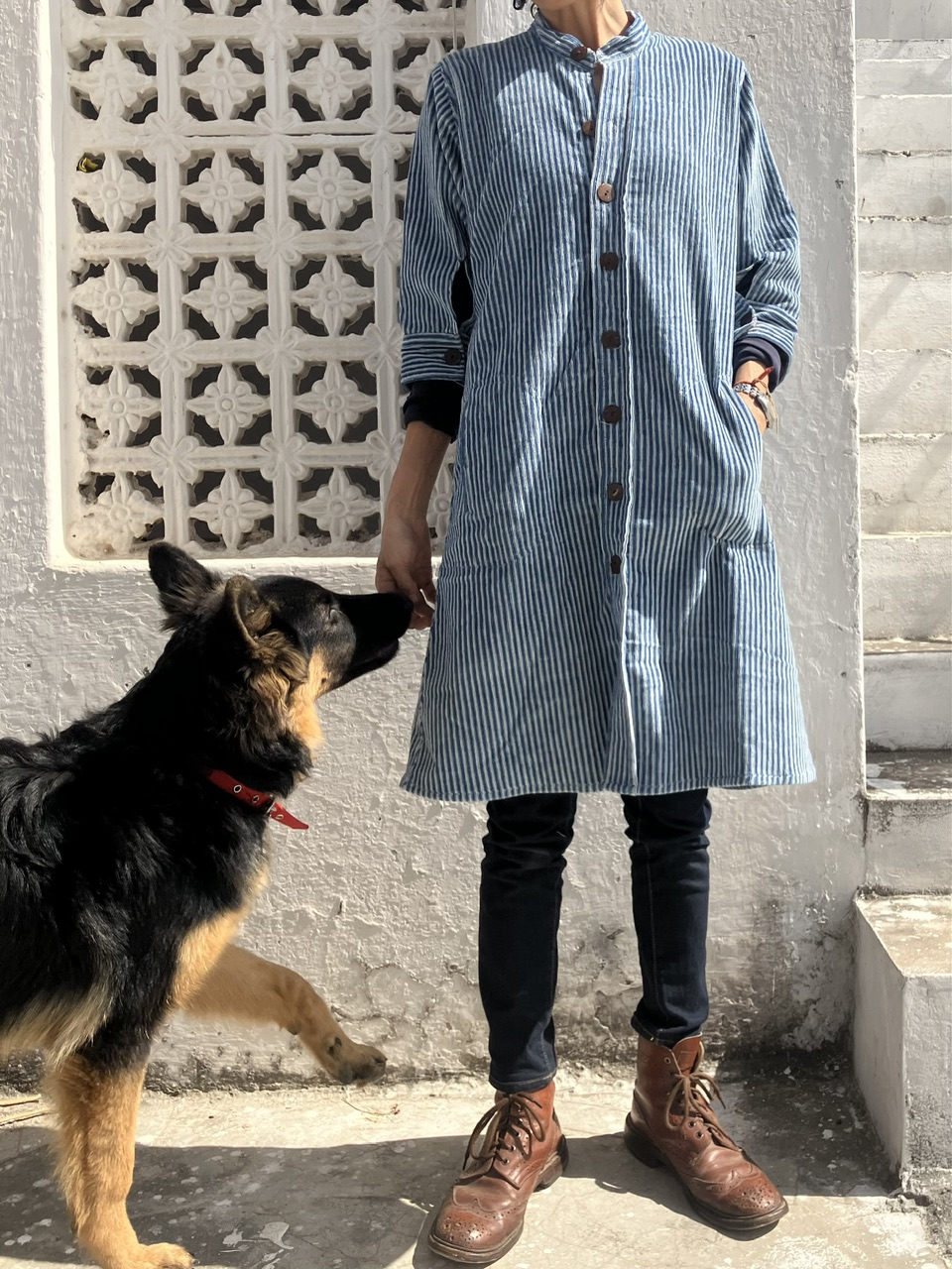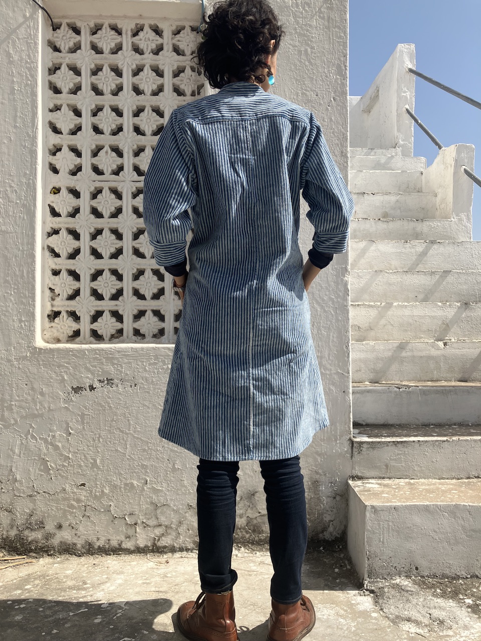 藍染リネン100% クルタワンピース★ボタンダウン膝丈 -